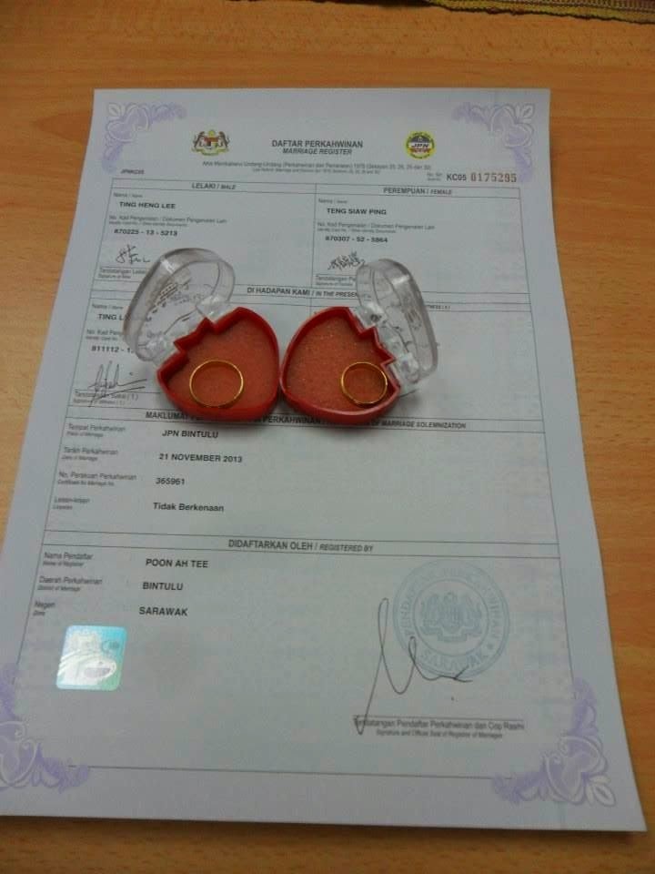 我们注册日,21/11/13(还是记录下,哪知转个头又忘记了),也不是特地预留的。选择一个婚礼前一个月的日期,选择一个是机票便宜的日期,就这样过了。这一天没什么来头,只是荔枝王子说他怕他自己忘记,1121是摩托车的车牌号码,也比较容易记。哪知道,过了一个星期,教会朋友问起,他就竟然在我面前“大胆”地说错,变成1112。